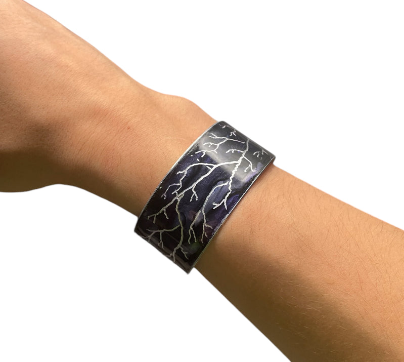 This cuff is made with recycled aluminum. This dark purple cuff has delicate etches of branches making it a stylish and one-of-a-kind piece.