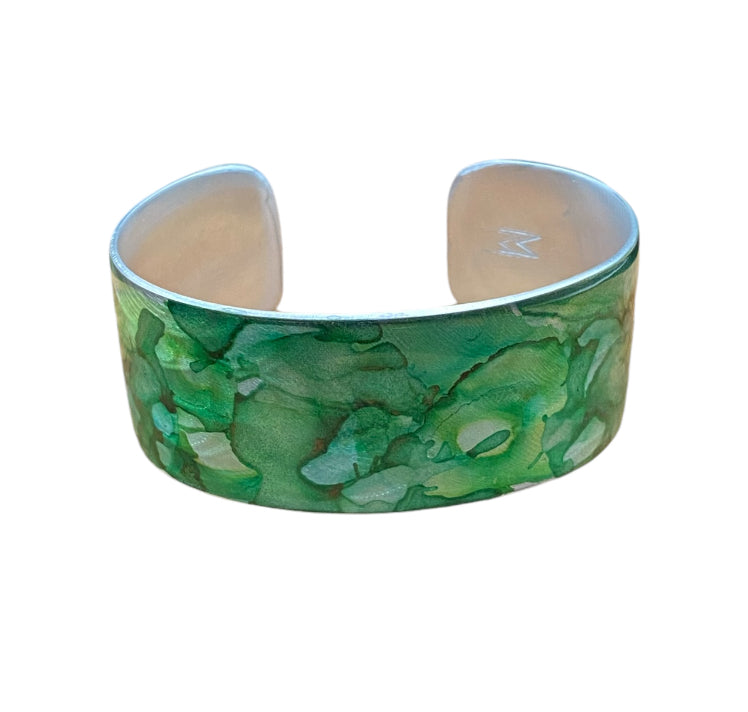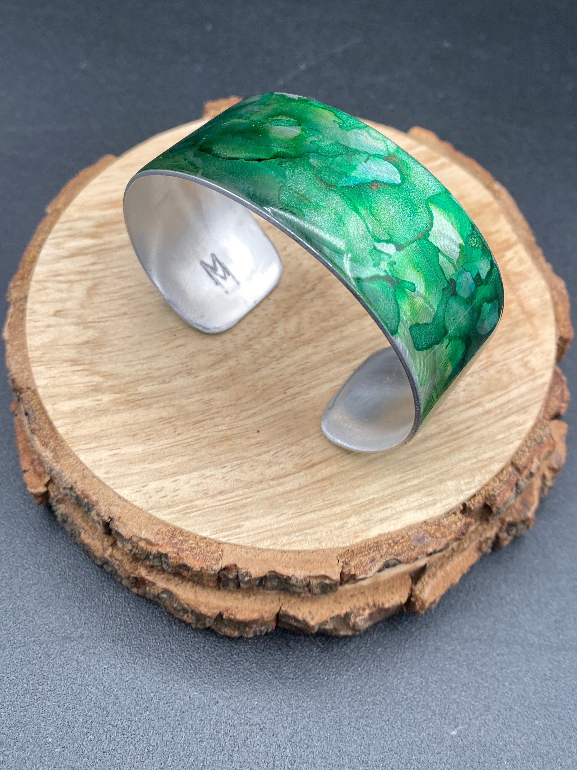 This cuff is made with recycled aluminum. This green cuff is light weight and stylish, and as always, one of a kind.