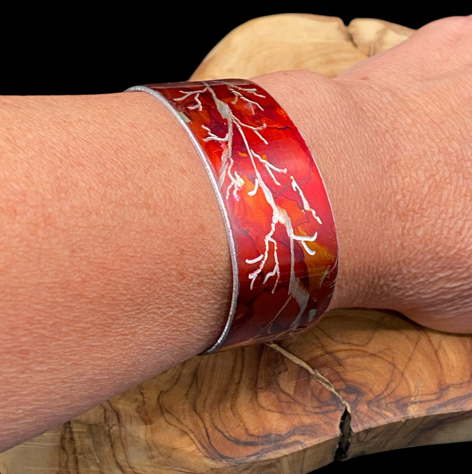This cuff is made with recycled aluminum. The etching on this cuff is reminiscent of a fiery fall haze. This cuff is light weight and stylish, and as always, one of a kind.