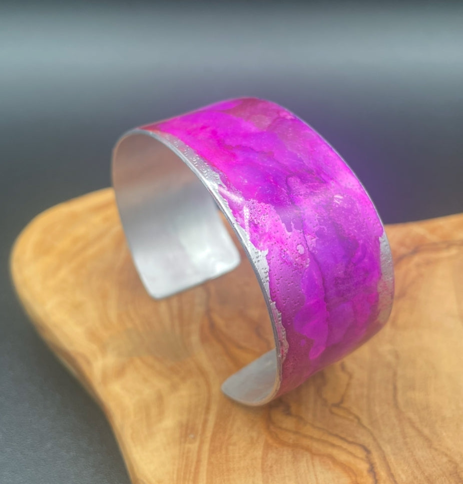 This cuff is made with recycled aluminum. The pinkish purple hue of this cuff streaks across the bracelet like paint splashes. Lightweight and bright this one is waiting for your jewelry box.
