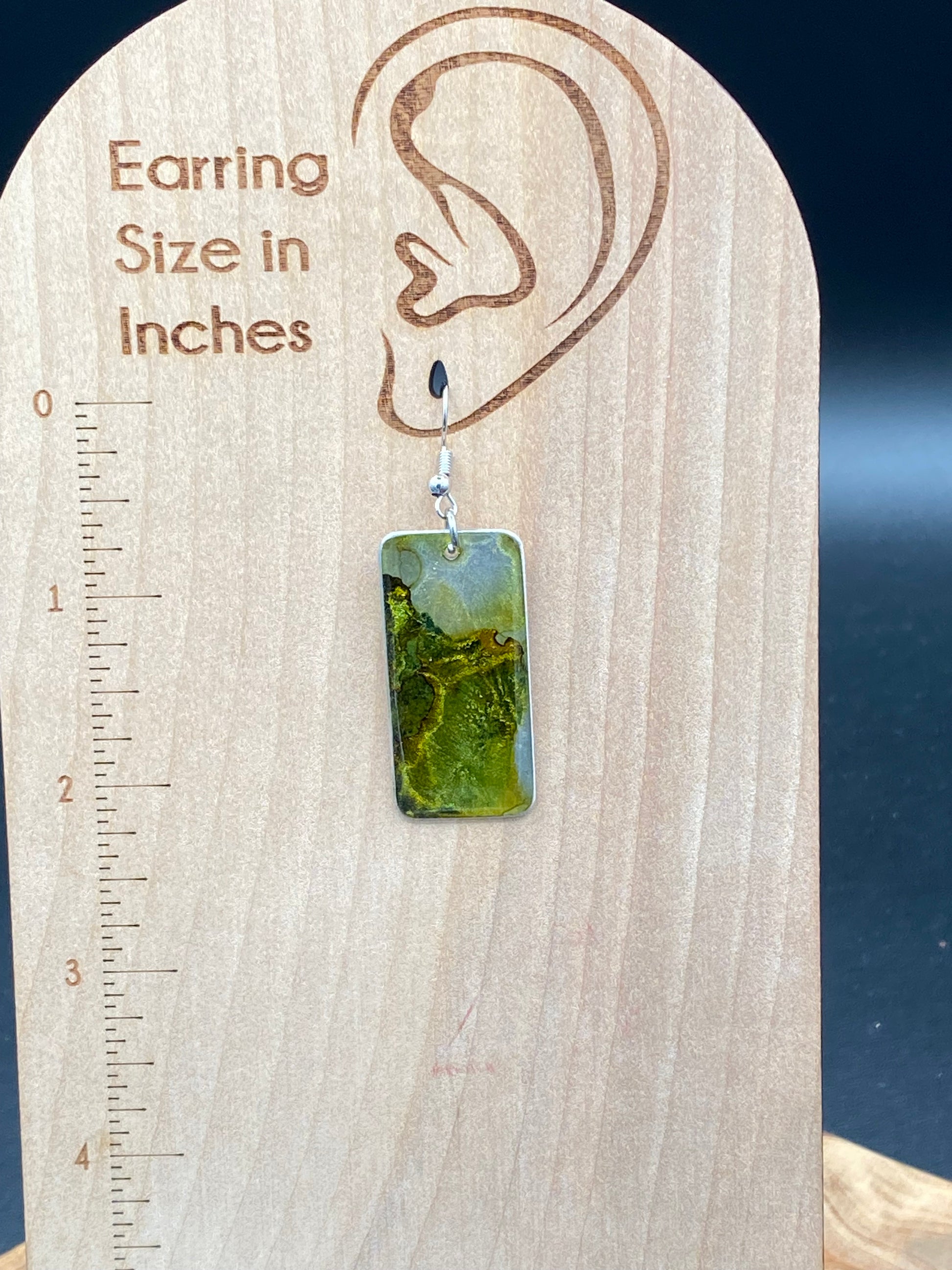Copper earrings resemble the forest with swirls of green hues. Truly one of a kind due to the color impressions.