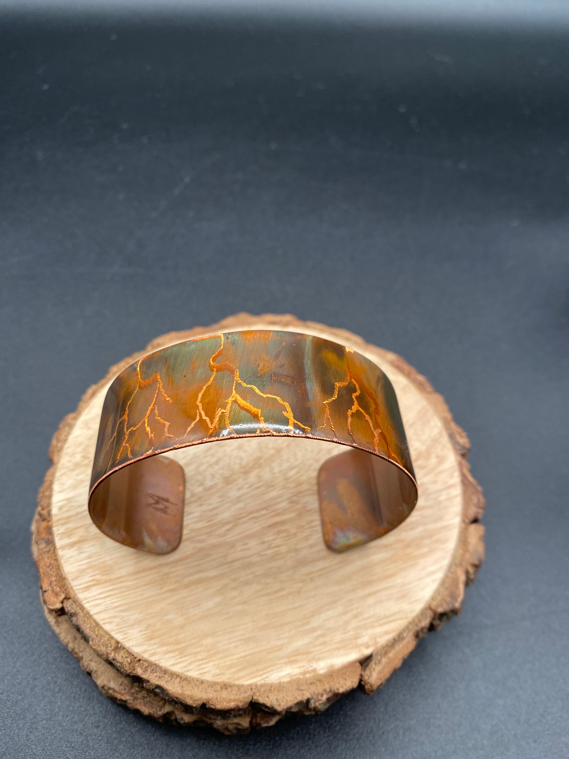 "This one-of-a-kind fire-painted copper bracelet is a true masterpiece of artisanal craftsmanship. The vibrant, fiery hues dance across the wide copper band, evoking the warmth and energy of a crackling flame. But what truly sets this piece apart is the intricate etching of lightning bolts that etch the bracelet sparking power and pizzazz.”